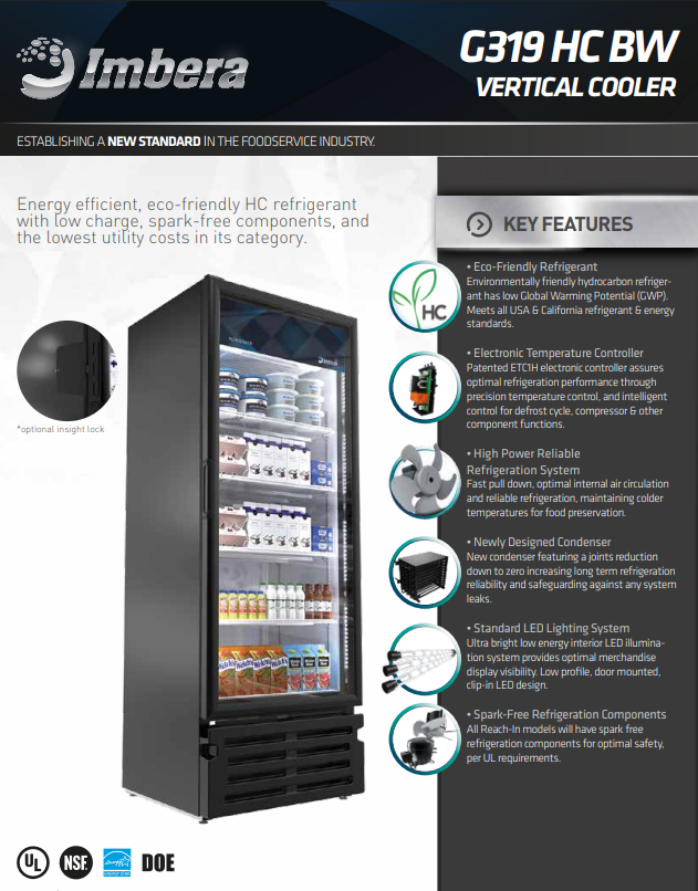 Energy efficient, environmentally efficient, feature spark-free components, low refrigerant charge & the most attractive product display. Cooler has a 3 year parts and 5 year refrigeration warranty.